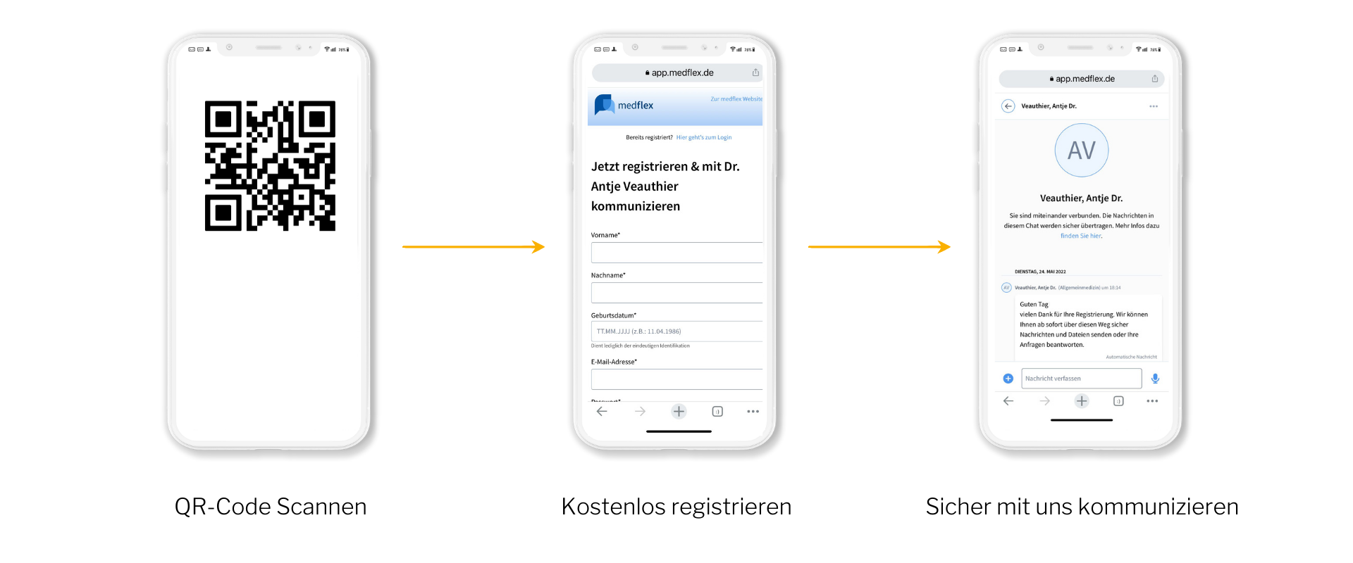 Über den sicheren Medflex-Messenger können wir z.B. Anfragen für Folgerezepte annehmen, Ihnen Befunde und Laborwerte übermitteln sowie Ihre Rückfragen beantworten.